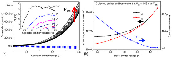 At values above 0.5 V, an increment of the emitter current as function of can be observed (green shade in Figure 4a). This area indicates the collector-emitter current modulation by the base voltage, and thus demonstrates a first step towards an operational GBHT. The small modulation of the collector-emitter current is illustrated in Figure 6a, where and are linearly plotted while varying the collector-emitter voltage at different constant base-emitter voltages ranging from 0 V to 1.5 V. At = 0 V, the collector current is still highly affected by . However, the variation of the collector current caused by can be highlighted. The increase of the collector current (), defined as the change of at = 0 V vs ≠ 0 V, can reach up to 40% as seen in the inset of Figure 6a.