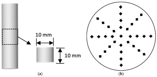 where HV is the Vickers hardness value, P is the load (kgf), D is the mean diagonal of the indentation pyramid (mm) and ɸ = 136°. To measure the Vickers microhardness, samples with a diameter of 10 mm and depth of 10 mm were obtained by cutting cylindrical specimens with a diamond saw cutter as shown in Figure 2a. Both ends of the obtained samples were successively polished with 400, 800, 1200 and 1500 grit polishing papers and placed in an oven at 55 °C for 24 h to remove the humidity. A load of 0.1 kgf was applied and maintained for 10 s. Microhardness values were measured at 1, 2, 3, 4 and 5 mm from the external surface, as shown in Figure 2b. A minimum of 8 readings were taken at each depth. The test was conducted using a Vickers hardness tester THV-1MD (Capital Instrument, Beijing, China).
