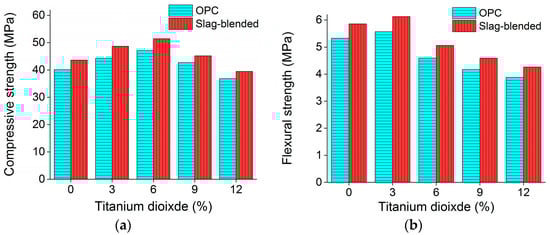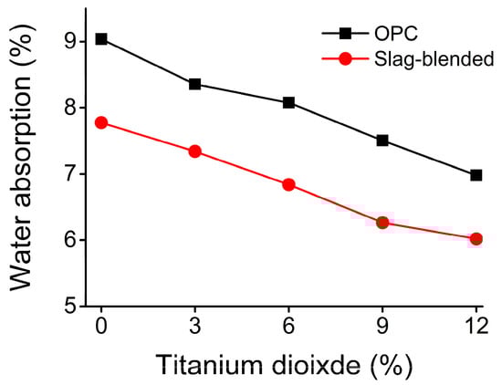 Figure 3 shows the variation of compressive and flexural strengths with the addition of nano-TiO2 in OPC and slag-blended mortars. Adding more than 6% nan-TiO2 as weight of the binder led to a reduction in compressive strength of mortars while adding more than 3% nan-TiO2 as weight of the binder led to a reduction in flexural strength of mortars. Increase in compressive strength was due to filler effect of nano-TiO2 []. The water absorption results are shown in Figure 4 which shows that water absorption is reduced with the addition of nano-TiO2 in both type of mortars. This positive effect can be ascribed to the nano-TiO2 particles, which acted as fillers, served as nucleation sites for the hydration reaction, hydration products precipitated around them and disconnected pores in the paste. The reduction in water absorption due to slag addition can be ascribed to the their later hydration and formation of secondary CSH in capillary pores [].