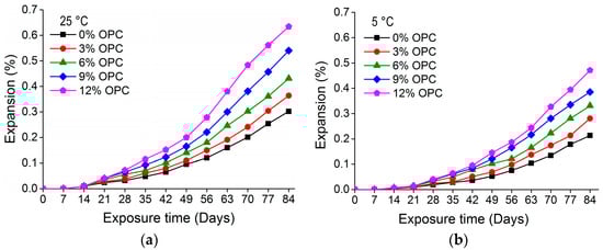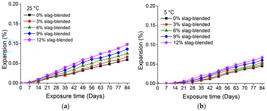 Figure 5 and Figure 6 show the expansion in nano-TiO2 containing OPC and slag-blended mortars immersed in Na2SO4 solution at 25 °C and 5 °C for 84 days, respectively. The results show an increase in expansion rate with the addition of nano-TiO2. At 25 °C, the expansion in 0% OPC mortars was 0.30%, while the expansion in 3%, 6% and 9% OPC mortars was 0.36%, 0.43% and 0.54%, respectively, after 84 days. The increase in expansion with the increase of nano-TiO2 occurred at both temperatures (25 and 5 °C). The comparison of expansion in OPC and slag-blended mortars showed that nano-TiO2 containing OPC mortars expanded more than nano-TiO2 slag-blended mortars. The expansion pattern differed between nano-TiO2 slag-blended and nano-TiO2 containing OPC mortars; whereas former exhibited a uniform rate of expansion but OPC mortars showed slow expansion initially and faster expansion at later times. Slag improves performance by acting as a physical filler and pozzolanic material []. Therefore nano-TiO2 containing slag mortars were more resistant to expansion. Storage temperature also showed a prominent effect on the rate of expansion of TiO2 containing mortars.