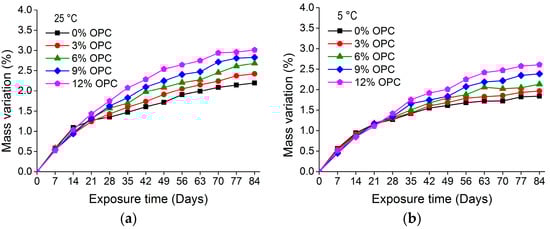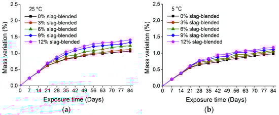 Figure 7 and Figure 8 show the mass variation for nano-TiO2 containing OPC and slag-blended mortars immersed in Na2SO4 solution at 25 and 5 °C, respectively. The addition of TiO2 in mortars resulted in an additional mass gain. After immersion for 84 days at 25 °C, 12% OPC and 12% slag-blended mortars gained 3.01% and 1.41% mass, respectively, while 0% OPC and 0% slag-blended mortars gained 2.19% and 1.06% mass, respectively. The increase in mass of mortars may be due to absorption of sodium sulfate solution and precipitation of gypsum and ettringite in pores and cracks. The effects of TiO2 addition on the rate of mass increase were negligible in first few weeks but prominent at later stages. The increase in mass was higher in mortars immersed in sulfate solution at higher temperatures. The addition of slag refined pores and reduced capillary pores and their connectivity [,,], hence reducing the absorption of sodium sulfate solution. Therefore, nano-TiO2 containing slag-blended mortars were less vulnerable to the formation of gypsum and ettringite and exhibited less expansion and variation in mass.