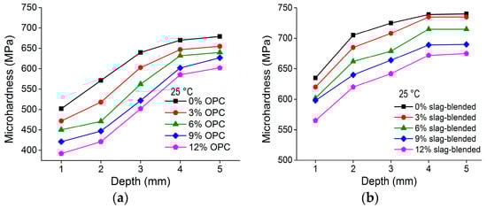 The variation in Vickers hardness in OPC and slag-blended mortars immersed in 10% Na2SO4 solution at 25 °C is shown in Figure 9. It shows a greater loss of surface hardness with the addition of nano-TiO2. This figure also shows that sulfate attack caused a greater loss of surface hardness in nano-TiO2 containing OPC mortars than in nano-TiO2 containing slag-blended mortars. In OPC mortars, most of the depth is affected and the peripheral area was softened with respect to the inner depth, while in slag-blended mortars, the loss of surface hardness value extended up to 3 mm depth. This indicates the resistance of nano-TiO2 containing slag-blended mortars to sulfate attack and an increase in sulfate damage due to the addition of nanoparticles.