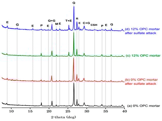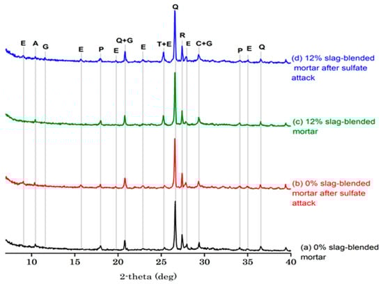 Figure 12 and Figure 13 show XRD graphs of the 0% and 12% OPC mortar and 0% and 12% slag-blended mortars stored in saturated limewater and Na2SO4 solution after 84 days of immersion at 25 °C, respectively. Ettringite, portlandite, quartz, calcite, anatase (TiO2), rutile, monosulfate and hydrated tetra calcium aluminate were observed in XRD graphs of 0% and 12% OPC and slag-blended mortars before immersion, as shown in Figure 12a,c and Figure 13a,c. Ettringite is a hydration product formed due to the reaction of gypsum present in cement clinker and forms when concrete is in a plastic state. Its formation provides dimensional stability to the mortar, as it compensates for chemical shrinkage. However, its formation in later stages in hardened concrete is detrimental []. The peaks of portlandite in the XRD pattern of slag-blended mortars (Figure 13a,c) were lower than OPC mortars (Figure 12a,c) due to the reaction of slag with portlandite, which consumed them during a pozzolanic reaction. XRD patterns of damaged OPC (Figure 12b,d) and slag-blended mortars (Figure 13b,d) showed new peaks of ettringite and gypsum after immersion in sulfate solution, existing peaks of ettringite were increased and portlandite peaks were decreased in intensity. The appearance of new peaks of ettringite and gypsum confirmed that expansion and cracking were due to the formation of ettringite and gypsum. Although slag-blended mortars had more Al2O3 content than OPC mortars but they showed resistance to sulfate attack than OPC mortars. In the case of hydration of slag, Al3+ is bound in calcium silicate gel as C-A-S-H which shelters it form attack of incoming sulfate ions []. Furthermore, less monosulfate is produced in slag mortars compared to OPC mortars []. Monosulfate serves as an important source of Al3+ ions for the formation of ettringite after attack of incoming sulfate ions []. Therefore, less ettringite is produced in slag blended mortars.