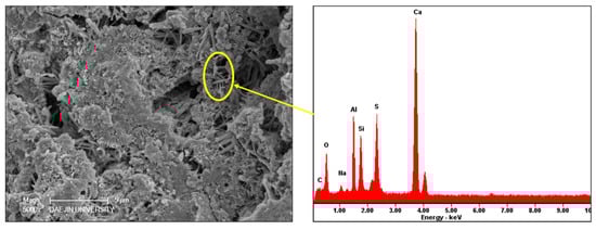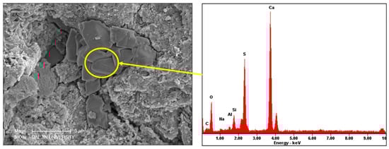 SEM image and EDS analyses of gypsum in 12% OPC mortar immersed at 25 °C in 10% Na2SO4 solution.