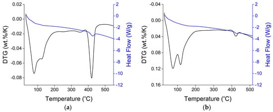 DSC results for (a) portlandite peaks at about 440 °C; (b) ettringite and gypsum peaks at 90–140 °C.