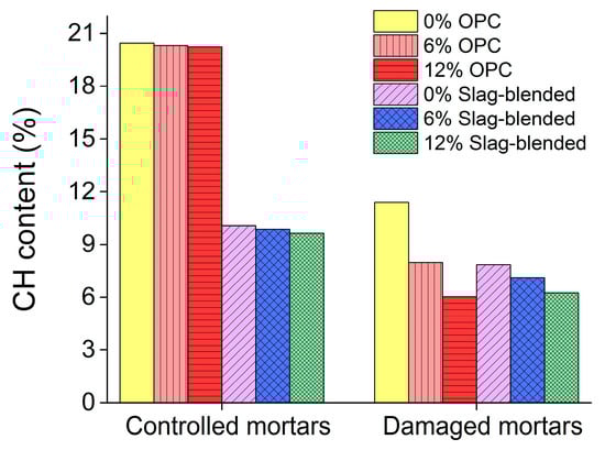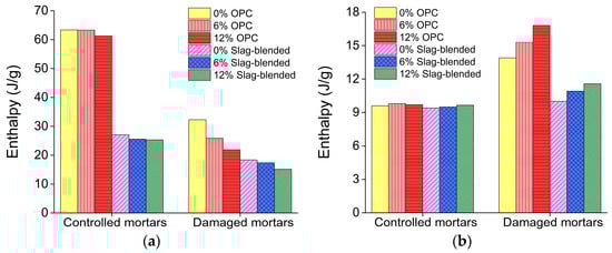 In Figure 17a, DTG curve shows two large peak peaks at 80 °C and 430 °C, these decompositions peaks are due to the dehydration of ettringite and portlandite respectively []. But after exposure to sulfate attack, the peak corresponding to the portlandite has been significantly reduced, a new peak has emerged at about 130 °C. This new peak is due to the decomposition of gypsum which was produced during sulfate attack. These new peaks can also be observed in XRD shown in Figure 12d. Figure 18 shows the percentage of portlandite in mortars stored in saturated limewater (controlled mortars) and Na2SO4 solution (damaged mortars) []. This figure shows that after sulfate attack, reduction in CH content is proportional to the increasing amount of nano-TiO2. Enthalpy of ettringite and gypsum corresponding to temperature 80–150 °C and portlandite corresponding to 400–500 °C was calculated from DSC curves [] and is shown in Figure 19. A decreasing trend in enthalpy of CH in mortar samples after exposure to sulfate solution can be observed with the addition of nano-TiO2. Enthalpy of ettringite and gypsum are shown in Figure 19b. Contrary to CH enthalpy, here an increase in enthalpy can be observed with the addition of nano-TiO2 after sulfate attack.
