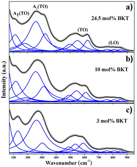 Figure 3 shows the Raman spectra deconvoluted with FITYK® using a Lorentzian function. The fitting was achieved with a χ2 under 0.058 and R2 over 0.99 for all compositions. In the Raman spectra of the samples with x = 0 to 6 mol % BKT, nine peaks were successfully deconvoluted (Figure 3c), whereas in the samples with x = 9 to 24.5 mol % BKT, the fitting was only achieved with ten peaks (Figure 3a,b). This methodology is similar to that reported by Kreisel et al. [39] for a BNT-BKT system.