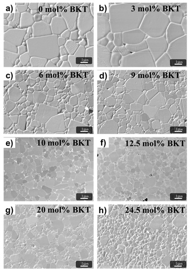 SEM micrographs of polished and thermally etched sintered ceramics in compositions (97.5−x)BNT + xBKT + 2.5BT with x = 0, 3, 6, 9, 10, 12.5, 20, and 24.5 mol % BKT for (a–h), respectiely.