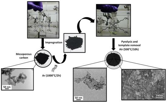 The first stage of synthesis involves impregnation of 1 mL of PHMS into 0.2 g of mesoporous carbon (Sigma-Aldrich, Bangalore, India) by continuously stirring for 48 h. The mixture was then pyrolyzed in argon atmosphere at 1000 °C for 2 h maintaining a heating rate of 2 °C/min in ambient conditions. The mixing of pyrolyzed product with 1 mL of TB for 24 h and subsequently heat-treated at 500 °C in air for 10 h forms the second stage. The completion of the first stage involves the formation of mesoporous SiOC–C composite and the second stage results in the materialization of TiO2/SiOC nanocomposite removing the carbon template. The schematic of the synthesis procedure is shown in Figure 2. The disordered mesoporous nature of the nanocomposite was visualized through SEM and the pore size estimated using Brunauer-Emmett-Teller (BET) technique was found to be around 6.8 nm.