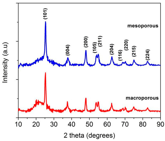 X-ray diffractograms (XRD) of macroporous and mesoporous materials showed in Figure 3 were used to understand the phase evolution of the nanocomposites. The XRD results clearly indicate the presence of anatase phase (JCPDS card No. 20-2242). Typically, the transformation temperature in undoped TiO2 from anatase to rutile is in the temperature range of 700–800 °C [63]. However, here, the anatase phase is stable till 1200 °C for macroporous sample which is attributed to the presence of the amorphous matrix that hindered the conversion from anatase to rutile phases. In the case of macroporous nanocomposite, the temperature was confined to 1200 °C since increasing the temperature above 1200 °C resulted in the crystallization of the undesirable rutile and silica phases (Figure S2), which are photocatalytically not as active as anatase [64]. The average crystallite size determined using Scherrer’s equation from the full width half maxima (FWHM) of the most intense TiO2 peak (101), was found to be 9 and 11 nm for macroporous and mesoporous materials, respectively.