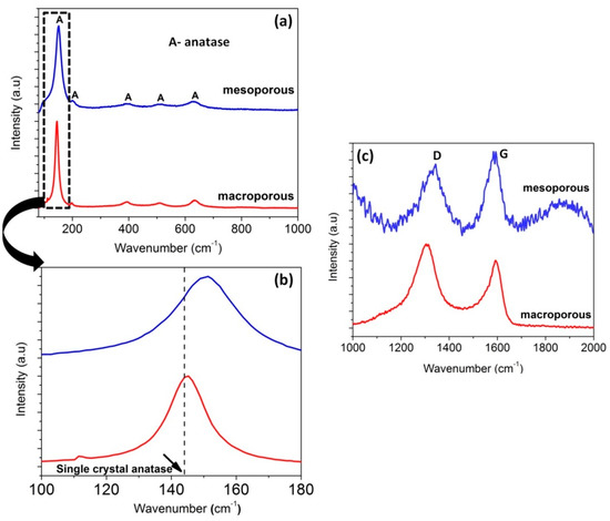 Raman spectroscopy performed on the as-synthesized samples confirmed the presence of anatase and free carbon (graphitic). The spectra shown in Figure 4a indicate the Eg, B1g, A1g or B1g, and Eg modes of the anatase phase. It confirms the absence of rutile phase in the samples. The Raman features of single crystal anatase as well as the macroporous and mesoporous nanocomposites are tabulated and shown in Table S1. However, in comparison with the single crystal anatase, both macroporous and mesoporous samples exhibited a frequency shift for Eg peak at 144 and 639 cm−1 (blue shift) whereas a red shift was observed for B1g (399) and A1g (519) peaks (Figure 4b). The shift in peaks could be attributed to the lower crystallite size and oxygen deficiency [65]. The crystallite size calculated from Scherrer’s equation also substantiates the frequency shift due to phonon confinement. Since the macroporous and mesoporous nanocomposites were synthesized via precursor route and involved heat-treatment, non-stoichiometry is expected [66].