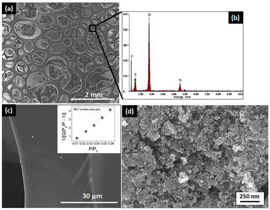 The microstructural characterization carried out with the aid of SEM revealed a foamy appearance for the macroporous samples (Figure 5a). The EDS analysis (Figure 5b) confirmed the presence of silicon, titanium, oxygen and carbon in the nanocomposite. The micrographs of the strut at higher magnification (Figure 5c) confirmed the absence of mesopores, which were as expected since the heat-treatment temperature chosen in the synthesis of macroporous samples (1200 °C) resulted in the sintering of particles leading to the collapse of pores [68]. The micrograph of mesoporous samples as shown in Figure 5d, indicates particle agglomeration with disordered mesoporous structure. The SEM and TEM micrographs of mesoporous carbon are shown in Figure S5.