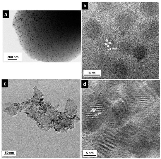 (a,c) TEM micrographs of macroporous and mesoporous nanocomposites revealing the well dispersed TiO2 nanoparticles in an amorphous SiOC matrix, respectively; (b,d) lattice fringes confirming the presence of anatase phase in macroporous and mesoporous nanocomposites, respectively.