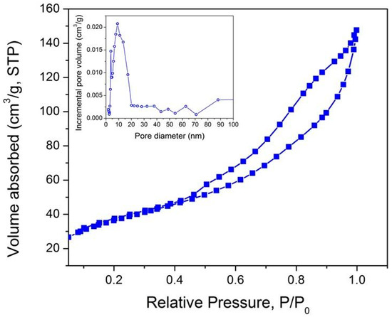 The pore architecture of the macroporous and mesoporous samples was assessed at the mesoscopic length scale by nitrogen gas adsorption–desorption measurements at 77 K. The BET surface area of the macroporous nanocomposite was found to be very small, 0.06 m2·g−1 (not shown) as expected. The N2 adsorption-desorption curve of the mesoporous sample is shown in Figure 7.