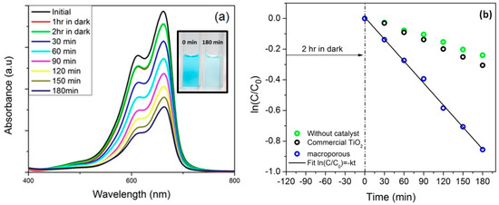 The adsorption/photocatalytic activity of macroporous nanocomposites was evaluated by measuring the decrease in concentration of methylene blue dye (MB) in dark as well as under visible light. The photocatalytic efficiency of the samples was measured by determining the concentration of MB dye at certain intervals after exposing it to the visible light (500 W tungsten halogen lamp with spectral distribution from 400 to 700 nm). The light source was cooled continuously with water cooled jackets so as to maintain ambient temperature. The self-degradation (without catalyst) and the photodegradation of MB using commercial TiO2 in visible light were performed for 180 min. It is known that MB self-photolyze under visible light illumination and the percentage efficiency is determined by the utilized light power. It was found that under the present condition; only 21% of MB is photolyzed after 3 h. The self-photolysis has also been reported earlier by Junwang Tang et al. where in around 25% of MB was degraded upon usage of a 300 W Xe arc lamp, λ > 420 nm after 2 h [73,74]. The photocatalytic degradation of commercial TiO2 (crystalline anatase, average particle size—0.5 µm, BET surface area 11 m2/g, SDFCL, India—Figure S7) was also observed to be minimal which pronounces the inactiveness of commercial TiO2 to visible light photocatalytic activity. Interestingly, as seen in Figure 9a, with prolonged exposure to visible light, the concentration of MB dye decreased. The photodegradation rate constant (k), a basic kinetic parameter, was used to quantify the photocatalytic activity of the samples. Reflecting from the previous studies, the experimental data was fitted with the Langmuir-Hinselwood kinetic model ln(C/C0) = −kt, where k is the photodegradation rate constant, C is the MB concentration at time t and C0 is the initial MB concentration at time t = 0 [75]. It is clearly observed from Figure 9b that under visible light exposure, the ln(C/C0) decreases linearly, indicating a first-order reaction. The calculated rate constant was found to be 4.78 × 10−3 min−1. It could be noted that the photodegradation constant was higher than that of the values reported by Hojamberdiev et al. for SiOC/TiO2 nanocomposite [47].