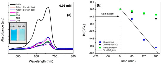 In order to understand the effect of visible light in the photocatalytic activity of mesoporous nanocomposite, a higher concentration of MB solution (0.06 mM) was prepared and kept in dark for 12 h and the solution was exposed to visible light. The change in absorbance spectra as a function of time clearly reveals the decolonization behavior (Figure 11a). The photodegradation constant determined via Langmuir–Hinshelwood kinetic model (Figure 11b) was found to be 3.0 × 10−3 min−1.
