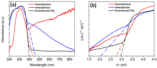 where α is the absorption coefficient, hν is the photo energy, K is a constant, and n is either 2 for a direct transition or 1/2 for an indirect transition. For TiO2 (anatase phase), n is taken as ½ [82]. Figure 12a,b depicts the UV-vis DRS spectra and the band gap energy calculated from the Tauc plot of macro/mesoporous materials and TiO2, respectively. The band gap values of macroporous and mesoporous nanocomposites were found to be 2.75 eV and 2.05 eV, respectively. The shift in optical band gap when compared to commercial TiO2 is believed to be due to the presence of carbon in the TiO2 lattice. The organic titanium precursor (TB) used in this study can effectively be a source of titanium, oxygen and carbon to form carbon doped TiO2. When the organic precursor attains a temperature more than its boiling point, it converts to its vapor form. Since the organic precursor contains carbon and owing to the high affinity of carbon towards Ti, diffusion of carbon into TiO2 lattice is expected to happen at higher temperatures similar to the observations of Wu et al. on the synthesis of carbon doped TiO2 using Ti(OC4H9)4 as precursor [83].
