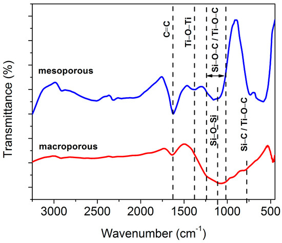 FTIR spectroscopy was done on the macroporous nanocomposites to identify the nature of bonds that compose the materials. It has been compared to the FTIR spectrum of the mesoporous sample. In Figure 13, the broad band in the range of 1020 to 1260 cm−1 could be due to the overlapping bands of Si–O–C (1030–1090 cm−1) and Si–O–Si (1120 cm−1) [84]. The bands located at 796 and 468 cm−1 are assigned to Si–C and Ti–O–Ti vibration modes respectively [85]. The absorption bands appearing at 1629 cm−1 in the spectra originates from the vibrations of C=C bonds [86]. The broad band in the range 1250–1050 cm−1 could also be attributed to the presence of Si–O–Si bonds [87]. The bands at 798 cm−1 and 1100 cm−1 is assigned to the presence of Ti–O–C bond [88]. The intensity of peak at 1629 cm−1 which is a characteristic band for C=C, is significantly higher for the mesoporous nanocomposite. This is a consequence of using carbon templates. In addition, the usage of mesoporous carbon template is expected to be beneficial for the formation of Ti–O–C bonds.