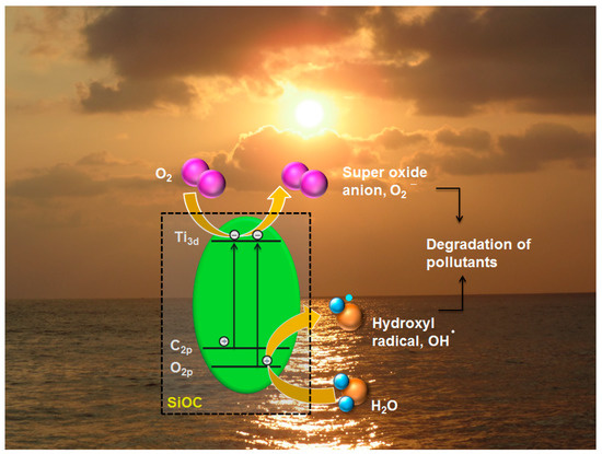 In general, low concentration of dye can only be removed by the photocatalytic degradation process. To treat a highly concentrated dye solution, materials that can contribute to the combinatorial effect of adsorption and photocatalysis is designed and mesoporosity serves that purpose. The photodegradation process is expected to be occurring in two steps. The first step involves the adsorption of MB molecules onto the samples (both in macro and mesoporous nanocomposite), while colossal adsorption occurs in the mesoporous couterparts. Subsequently, upon the illumination of visible light, the active TiO2 nanocrystals embedded in SiOC matrix gets excited to generate hydroxyl and superoxide radicals. This eventually will lead to the decomposition of MB molecules. The adsorption process only governs the kinetics of the degradation mechanism.
