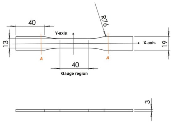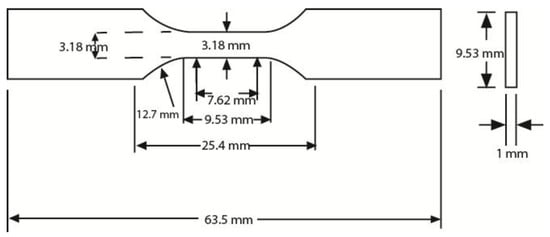 According to the ASTM D638 standard, for rigid and semi-rigid plastics, type I and type II specimens are to be used with materials having a thickness of 7 mm [22]. Type III specimen must be used for material having a thickness greater than 7 mm, while type IV specimen is to be used when there is a need to compare materials in different rigid cases [22]. Type V specimen is to be used for material having a thickness of 4 mm or less [22]. Thus, for the specimen used in this tensile test, ASTM D638 type V was chosen and is shown in Figure 2.
