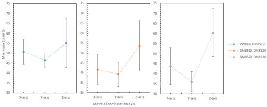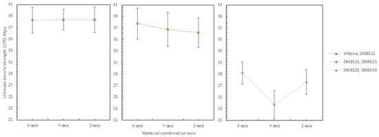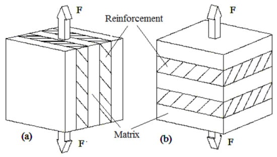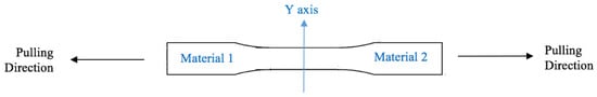 On the other hand, iso-stress refers to the condition whereby load is applied normal to the orientation of the fibers [27]. The normal stresses for matrix and fibers are the same. This condition can be applied to the multi-material printing orientation of the Y-axis as illustrated in Figure 9. Since both materials have the same cross-section, upon application of the load, they will have the same normal stress according to Equation (7):
