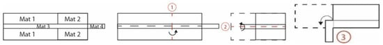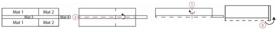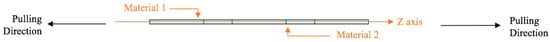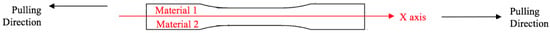 As the name implies, iso-strain requires the composite components to undergo the same deformation strain, whereby the load direction is the same as the fiber direction [27]. In our case, the whole specimen is the composite. Material 1 can be approximately treated as a matrix while material 2 can be approximately treated as a fiber. Iso-strain can be applied to the multi-material printing orientation of the X-axis and Z-axis (XY plane) as illustrated below in Figure 7 and Figure 8. Both materials undergo the same deformation strain.