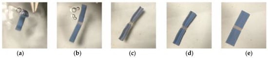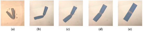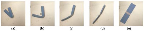 Method 1—the sequence of unfolding for 0.5 mm sample. (a) Unfold along folding line 1; (b) Continues to unfold; (c) Unfold along folding line 1 and unfold along folding line 2; (d) Continue to unfold along both folding lines; (e) Fully unfolded specimen.