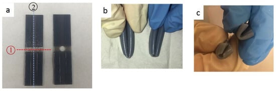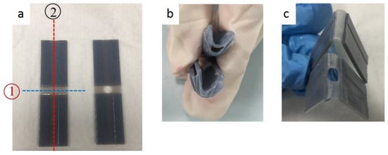 Based on the tensile test results, DM8530 material had near 100% recovery. Therefore it was selected to study the influence of hinge thickness in the multifolding process. A series of tests were conducted using DM8530 material. All the selected four materials display good and similar shape recovery properties (See Figure 14 later). Therefore we used DM8530 as a representative of the four for cross-foldability study. We expected the other three materials to perform the same way as DM8530 when 4D printed. There were 12 specimens of Length × Width × Thickness = (60 × 15 × 1.5) mm. Each specimen was designed with two crossed folding lines as shown in Figure 4, For folding line 1, the thickness (note: not the width of the channel) was 0.1 mm, 0.3 mm, and 0.5 mm thickness and for folding line 2, the thickness was a constant of 1.0 mm. There were two samples with hole and two samples without hole for each thickness. A hole was designed at the crossing point to eliminate the overlapping crossfolding region.