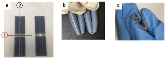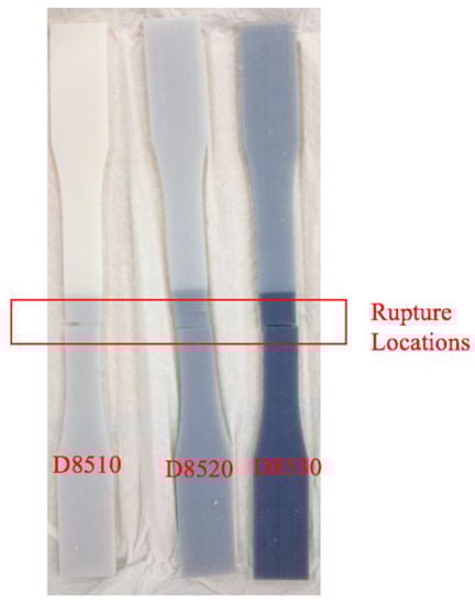 The materials used in this research are based on two basic proprietary materials provided by Stratasys (Eden Prairie, MN, USA), namely TangoBlackPlus (TB) and VeroWhitePlus (VW). Compared to TB, which is rubbery and has a great extent of elongation, VW is a rigid and opaque material that has high Young’s modulus, great tensile strength, and 10–25% of elongation before break. TB liquid resin comprises urethane acrylate oligomer, exo-1,7,7-trimethylbicyclo hept-2-yl acrylate, methacrylate oligomer, polyurethane resin, and photoinitiator. VW liquid resin consists of isobornyl acrylate, acrylic monomer, urethane acrylate, epoxy acrylate, acrylic monomer, acrylic oligomer, and photoinitiator. By mixing these two materials, new materials possessing different glass transition temperatures (Tg) can be obtained. In this research, four materials, VW and three mixtures from VW and TB (DM8510, DM8520, and DM8530) were used. All three mixtures are Stratasys’ proprietary digital materials (DM), with VW as the primary component and TB the secondary component. The percentage of TB in each has not been released by Stratasys, but the order is known as follows: DM8510 < DM8520 < DM8530 (highest percent of TB) [20,21].