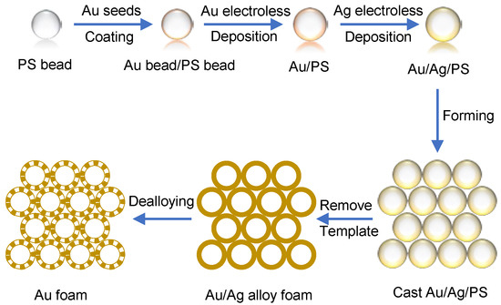 Over the last decade, a great number of synthesis strategies have been developed to fabricate hierarchically porous materials, such as dual surfactant templating, colloidal crystal templating, polymer templating, bioinspiring process, and flame transport approach [1,2,3,16,17]. This work was inspired by previous experiments which were managed to establish an optimal template-dealloying route to prepare ultralow density Au foams [18,19,20]. The detailed template-dealloying process to fabricate hollow-structured Au foams with structural hierarchy was revealed in our previous research [19,20], and a schematic illustration is shown in Figure 1. Polystyrene (PS) microspheres with diameter of m, and were adopted as the sacrificial template, Au and Ag sources. After electroless deposition of Au and Ag onto PS beads, self-supported Au–Ag bimetal foams with hollow-shell morphology were prepared by filter-cast forming of PS/Au/Ag microspheres and heat-treatment of the preformed monolithic samples. Self-supported Au foams with bimodal porous structure were produced after dealloying of Ag. Figure 2 presents the microstructure of prepared Au foam which exhibits the unique features of the combined large void space in the core and the bicontinuous nanoporous gold (np-Au) network in the shell.