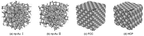 Figure 5 also compares the results for Young’s modulus and yield stress of np-Au characterized by various experimental methods. It clearly shows that the Young’s modulus and yield stress of np-Au can vary by two orders of magnitude for a certain relative density. The main reasons come from the following three aspects. First of all, the mechanical response of np-Au depends on not only the relative density but also the topological geometry of the np structures, generally an ordered structure is stiffer and stronger than a stochastic structure [27,28]. Besides, experimental investigations were derived from np-Au with feature size ranging from several to hundreds of nanometers, and due to “size effect”, np-Au has been shown to support the “smaller is stronger” trend down to characteristic length scales as small as 10 nm [39,40,43,49]. Furthermore, the network connectivity has been suggested as a structural feature that accounts for the anomalous mechanical properties of np metals, while it tends to decrease during the coarsening in which some ligaments pinch off [44,45]. In our simulation, however, the models are free of “size effect” and assumed as open-cell foam without ligaments pinch off.