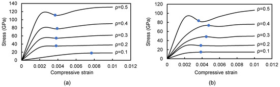 The macroscopic stress-strain curves obtained from the simulations on the np-Au samples with relative density ranging from 0.1 to 0.5 are presented in Figure 4. The relative density significantly influences the deformation behavior of np-Au in stiffness, seen in the initial slope of the curves, as well as in strength, visible as the 0.2% offset stress indicated on the curves by filled circles. In addition, it should be noted that the peak stress become more distinct with increasing relative density. It is shown that the compressive behavior consists of two different deformation stages in early compression (srain ). Initially, structural elements (i.e., ligaments) suffering the bending demonstrate a linear elastic compression behavior. With the further compression, the open cells collapse into plastic yielding and thus the stress-strain curve exhibits a definite plateau. Moreover, the linear elastic region for np-Au I with higher relative density ends at strain of about 0.25, while the region for np-Au II exhibits a more complicated variation due to its relative amorphous structure.