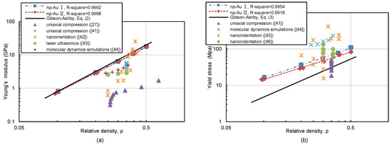 where and are the overall foam Young’s modulus and yield strength, and are the Young’s modulus and yield strength of ligaments materials, and is the relative density. in our simulation. The relative Young’s modulus and relative yield strength of np-Au varied with relative density in a power-law relation from simulation results are now plotted in Figure 5a,b, respectively. The axis scales are log–log, so that the results along with the Gibson–Ashby’s prediction of Equations (2) and (3) show up as the straight lines. The scaling laws of relative Young’s modulus and relative yield strength for np-Au I and np-Au II can be estimated by fitting these data, respectively: