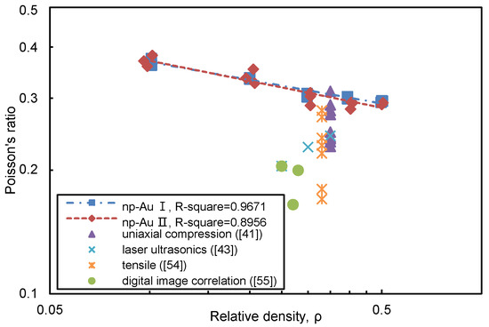 The elastic Poisson’s ratio of np-Au is now plotted in Figure 6 as a function of . The scaling laws of for np-Au I and np-Au II can be estimated by fitting these data, respectively: