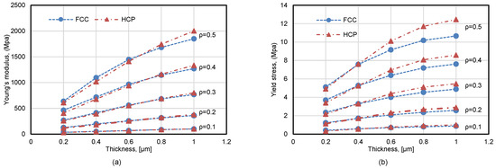 The Young’s modulus and yield stress of Au foams varied with the thickness t of the shell from simulation results are now plotted in Figure 7a,b, respectively. It is shown that the mechanical properties of the foams incline with the increasing thickness and/or relative density of the shell. The relative density has a higher influence on the stiffness and strength than the thickness. For example, the value of Young’s modulus is about 30 MPa at t = 0.2 m and , and it could ascend more than 20 times to nearly 650 MPa with increasing relative density of 0.5, while the value only ascends to nearly 100 MPa with increasing thickness of 1 m.
