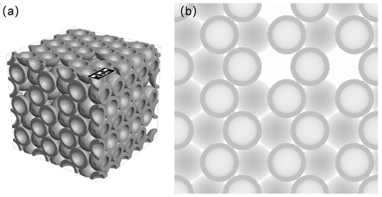 Understanding the stiffness and strength of such metal foam under uniaxial compression could provide insights for their both synthesis and applications under extreme conditions. The above-mentioned metal foam consists of a two-level model: the first one is bicontinuous nanoporous model proposed to describe the nanoscale interactions in the shell, another is hollow sphere-packing model representing the micrometre-scale geometrical structure of bulk foam. A common computational simulation method to investigate the mechanical properties of foams is finite elements method (FEM) [21,22,23,24,25,26,27,28], in which the geometries are generated from nanoscale/microscale resolution X-ray computed tomography (nano-CT or micro-CT) [21,22], focused ion beam scanning electron microscopes (FIB-SEM) [23,24], phase field method [28], and some of modeling software [25,26,27,28]. Moreover, molecular dynamics also is a powerful tool to describe the movements of atoms or molecules in a large system to obtain the physical properties for nanoporous metals [29,30,31]. In this work, however, another method in terms of finite volume method (FVM) was used to investigate mechanical properties of the new topological materials through simulation and fine-tune the design. The advantages of FVM are available usage on unstructured grids, integral formulation of conservation laws, and basis on cell averaged values, which means more effective and fast compared to conventional methods [32,33,34,35].