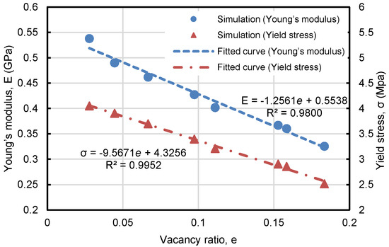 where is the volume of the vacancies (i.e., the removed spheres), and is the volume of the remaining spheres. The simulation results from a series HCP foams with and are shown in Figure 8. It is indicated that both the Young’s modulus and yield stress are shown a highly linear relationship with vacancy ratio e. According to the two equations fitted in Figure 9, the foam loses its stiffness by 40% and yield strength by 45% at . When , the material almost loses its entire stiffness and load-carrying capability, so the vacancy defect should be controlled accordingly to warrant the desired mechanical properties of metal foams.