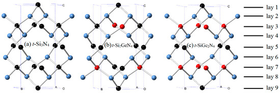 The crystal structures of t-Si3N4, t-Si2GeN4, t-SiGe2N4, and t-Ge3N4 are displayed in Figure 1. The t-Si2GeN4, t-SiGe2N4, and t-Ge3N4 are obtained when germanium atoms replace the Si atom of t-Si3N4 with the smallest energy. The equilibrium lattice parameters of t-SixGe3−xN4 and c-SixGe3−xN4 (x = 0, 1, 2, 3) alloys with the related reference data are listed in Table 1. As seen, our calculated lattice parameters for t-Si3N4 and c-SixGe3−xN4 (x = 0, 1, 2, 3) alloys are in excellent agreement with the existing results. The lattice parameters of t-SixGe3−xN4 (x = 0, 1, 2, 3) alloys as a function with the Ge component are shown in Figure 2a. From Figure 2a, the lattice parameter a increases with an increase in the percentage of the germanium composition, except for t-Ge3N4. The lattice parameter a of t-Ge3N4 is slightly smaller than t-SiGe2N4; the possible cause of this phenomenon is that the angle of ∠Si-N-Ge (113.95°) and ∠Ge-N-Ge (112.16°) in t-SiGe2N4 decreases in t-Ge3N4 (∠Si-N-Ge: 112.86°; ∠Ge-N-Ge: 111.75°) parallel to the ac plane. Moreover, the lattice parameter c of t-Si3N4, t-Si2GeN4, and t-SiGe2N4 is almost the same; however, the lattice parameter c of t-Ge3N4 is far greater than that of the others. The bond length of the silicon nitrogen bond is certainly smaller than that of the germanium nitrogen bond in the same structure. From t-Si3N4 and t-Ge3N4, as the substitution of germanium atoms for silicon atoms increases and the substitution occurs primarily along the c axis, the growth of germanium nitrogen bonds is mainly manifested in the c axis direction. In Figure 1c, the silicon or germanium atoms occupy five of the nine layers of atoms along the c axis. From t-Si3N4 to t-Si2GeN4, the germanium atoms only replace two of the silicon atoms; thus, at this time, the increase along the c axis is very small. In addition, from t-Si2GeN4 to t-SiGe2N4, the germanium atoms are replaced on the same layers, so the increase along the c axis is very small. From t-SiGe2N4 to t-Ge3N4, all of the germanium atoms replace the silicon atoms, so the lattice parameter c suddenly increases.