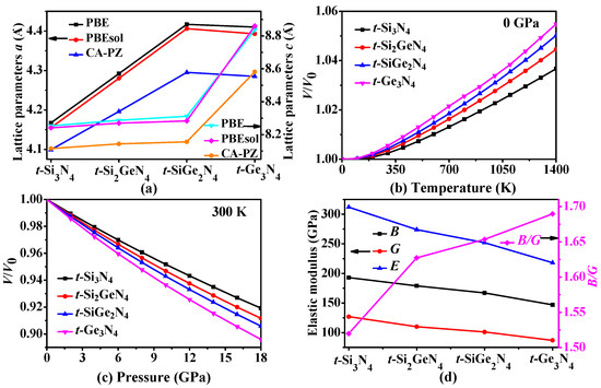 Calculated lattice parameters a and c (a) of t-Si3N4, t-Si2GeN4, t-SiGe2N4, and t-Ge3N4 by PBE, PBEsol, and CA–PZ methods; the volume V/V0 compression as functions of temperature (b) and pressure (c); the elastic moduli for t-Si3N4, t-Si2GeN4, t-SiGe2N4, and t-Ge3N4 (d).