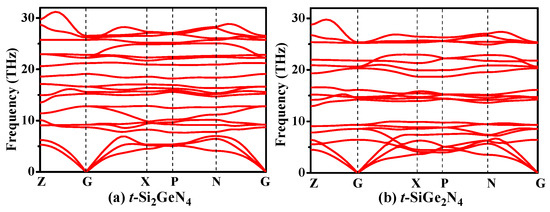 The elastic constants, elastic moduli, and Poisson’s ratio for t-SixGe3−xN4, c-SixGe3−xN4, and m-SixGe3−xN4 (x = 0, 1, 2, 3) alloys are all listed in Table 2. The elastic constant is an index that reflects the ability of materials to resist elastic deformation. From Table 2, the elastic constants of the t-Si2GeN4 and t-SiGe2N4 satisfy Born’s mechanical stability criteria of tetragonal symmetry [57]; as a result, t-SixGe3−xN4 (x = 0, 1, 2, 3) alloys are mechanically stable. In order to confirm the stability of t-Si2GeN4 and t-SiGe2N4, the phonon spectra are calculated at ambient pressure, which are shown in Figure 3. There is no imaginary frequency, proving that the alloys are stable.