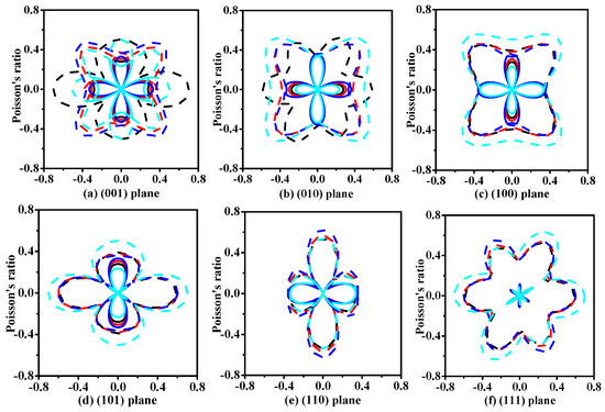 It is well known that elastic anisotropy has important implications in engineering science and crystal physics. The directional dependence of the anisotropy is calculated by the elastic anisotropy measures (ELAM) [63,64] code. The two-dimensional (2D) representation of Poisson’s ratio v in (001), (010), (100), (101), (110), and (111) planes for t-SixGe3−xN4 (x = 0, 1, 2, 3) alloys are shown in Figure 4. Clearly, the 2D figures of Poisson’s ratio all have a great deviation degree from a circular shape, indicating that the t-SixGe3−xN4 (x = 0, 1, 2, 3) alloys exhibit anisotropy in Poisson’s ratio. Moreover, the four alloys present the different degree of anisotropy on Poisson’s ratio in different planes. The maximum Poisson’s ratio for t-Si3N4, t-Si2GeN4, t-SiGe2N4, and t-Ge3N4 are 0.59, 0.60, 0.62, and 0.70, respectively, following the sequence t-Si3N4 > t-Si2GeN4 > t-SiGe2N4 > t-Ge3N4. The following directional dependence of anisotropy is usually described by vector direction (θ, φ), where θ (φ) represents the angle between the vector and the x-axis (z-axis) positive direction, and they are expressed in radians [63,64]. The positions of the maximum Poisson’s ratio for t-Si3N4, t-Si2GeN4, t-SiGe2N4, and t-Ge3N4 appear at θ = 0.79, φ = 0.00; θ = 2.36, φ = 0.00; θ = 1.57, φ = 3.93; and θ = 2.33, φ = 0.00, respectively.