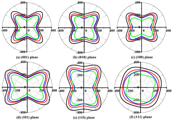 2D representation of Young’s modulus for t-SixGe3−xN4 (x = 0, 1, 2, 3) alloys in the (001) plane (a); (010) plane (b); (100) plane (c); (101) plane (d); (110) plane (e); and (111) plane (f). The black, red, blue, and green lines represent the Poisson’s ratios of t-Si3N4, t-Si2GeN4, t-SiGe2N4, and t-Ge3N4, respectively. All units are in GPa.