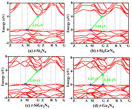 As is known, the electronic structure determines the physical and chemical properties of materials. The electronic band structures of t-Si3N4, t-Si2GeN4, t-SiGe2N4, and t-Ge3N4 are shown in Figure 6, according to calculations with the HSE06 hybrid functional [66,67]. From Figure 6, the t-SixGe3−xN4 (x = 1, 2, 3) alloys are all indirect band gap semiconductor materials, and t-Ge3N4 is a quasi-direct band gap semiconductor material. In addition, the band gaps of t-Si3N4, t-Si2GeN4, t-SiGe2N4, and t-Ge3N4 are 4.26 eV, 3.94 eV, 3.83 eV, and 3.25 eV, respectively; the conduction band minima are all located at the M point, and the valence band maxima are all located at the G point. With the increasing percentage of the Ge composition, the band gap decreases. For t-Ge3N4, the direct gap at G point is 3.34 eV, which is slightly larger than the indirect gap of 3.25 eV; as a result, t-Ge3N4 is a quasi-direct gap semiconductor. The calculated band gaps that utilize other functions, such as PBE, PBEsol, and CA–PZ, are listed in Table 1. It is known that the calculated band gaps are usually underestimated with DFT; i.e., the true band gap is larger than the calculated results. The band gaps of t-Si3N4, t-Si2GeN4, t-SiGe2N4, and t-Ge3N4 with the HSE06 hybrid functional are found to be much larger than those calculated by other functions.