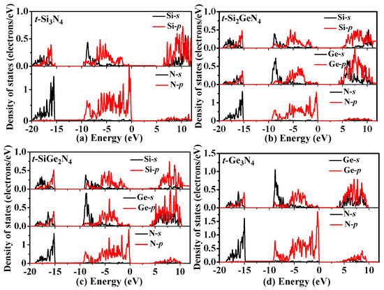 Comparison of total density of states and partial density of states for t-Si3N4 (a); t-Si2GeN4 (b); t-SiGe2N4 (c); and t-Ge3N4 (d). The black and red curves represent the s states and p states, respectively, of silicon, germanium, and nitrogen atoms.