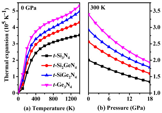 Temperature (a) and pressure (b) dependence of the thermal expansion coefficients for t-Si3N4, t-Si2GeN4, t-SiGe2N4, and t-Ge3N4.