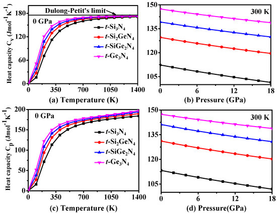 The variation of the heat capacity (CV) at constant volume and the heat capacity (Cp) of t-Si3N4, t-Si2GeN4, t-SiGe2N4, and t-Ge3N4 at a constant pressure versus temperature and pressure variations are shown in Figure 9. The curves of heat capacity for t-Si3N4, t-Si2GeN4, t-SiGe2N4, and t-Ge3N4 have similar tendencies, as do the variations of the temperature and pressure that are shown in Figure 9. From Figure 9a, the heat capacity curves are proportional to T3 when T < 300 K, and the growth rate of the heat capacity decreases above 300 K. For T > 800 K, the heat capacity gradually approaches the fixed value of the Dulong–Petit limit (174.54 J mol−1 K−1) [68]. As shown in Figure 9c, the change regulation of CP is similar to that of CV below 800 K. CP increases linearly as the temperature increases above 800 K. From Figure 9b,d, the effect of pressure and temperature on heat capacity is the opposite; i.e., the heat capacities for t-SixGe3−xN4 (x = 0, 1, 2, 3) alloys decrease with an increase in pressure at a given temperature. Moreover, the sensitivity of heat capacity to temperature is far greater than that to pressure. Figure 9 also shows that the heat capacity for t-SixGe3−xN4 (x = 0, 1, 2, 3) alloys follows the sequence: t-Ge3N4 > t-SiGe2N4 > t-Si2GeN4 > t-Si3N4.