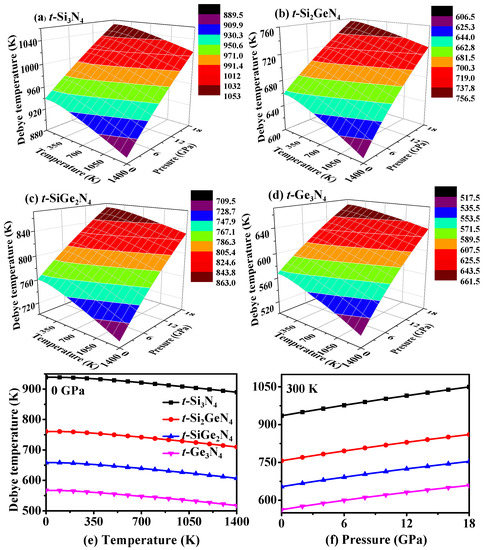 Figure 10a–d shows the variations of Debye temperature ΘD of t-SixGe3−xN4 (x = 0, 1, 2, 3) alloys with the temperature and pressure. From Figure 10a–d, the change regulation of ΘD for t-SixGe3−xN4 (x = 0, 1, 2, 3) alloys has the same trend under variable temperature and variable pressure. In addition, the effect of the pressure on ΘD is found to be more significant than that of temperature. To better illustrate the effect of temperature and pressure variation on the ΘD of t-SixGe3−xN4 (x = 0, 1, 2, 3) alloys, the ΘD values as functions of temperature or pressure are shown in Figure 10e–f. From Figure 10e, the ΘD remains nearly constant from 0 K to 200 K, and when T > 200 K, the ΘD decreases linearly. Moreover, at a given temperature, the value of ΘD almost increases monotonously with an increase in pressure, as shown in Figure 10f. From 0 K to 1400 K, ΘD decreases by 5.2%, 6.7%, 7.8%, and 8.8% for t-Si3N4, t-Si2GeN4, t-SiGe2N4, and t-Ge3N4, respectively, and from 0 GPa to 18 GPa, ΘD decreases by 12.2%, 13.7%, 15.3%, and 17.1%. In addition, the larger the Ge composition is, the larger the influence to ΘD is. The values of ΘD for t-Si3N4, t-Si2GeN4, t-SiGe2N4, and t-Ge3N4 calculated by the quasi-harmonic Debye model (938 K, 761 K, 658 K, and 567 K) are in agreement with those calculated by the elastic modulus [65] (ΘD = (h/kB)[(3n/4π)(NAρ/M)]1/3vm, vm = [(2/ + 1/)/3]−1/3, vp = [(B + 4G/3)/ρ]1/2, vs = (G/ρ)1/2; 937 K, 767 K, 666 K, and 571 K) at 0 K and 0 GPa.