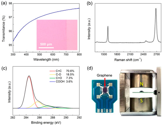 (a) The visible light transmittance of CVD graphene films. Inset: OM image; The corresponding (b) Raman and (c) high-resolution XPS C1s spectra; (d) Photograph of the graphene device measured based on the Van der Paul configuration.