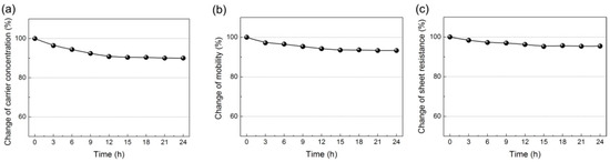 The changes of (a) carrier concentration; (b) mobility and (c) sheet resistance of graphene films as a function of the incubation time in DNA probe/1× TE buffer.