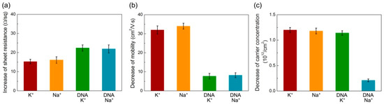 The variations of (a) sheet resistance; (b) mobility; and (c) carrier concentration of the graphene devices with and without DNA modification for distinguishing between K+ and Na+ ions.